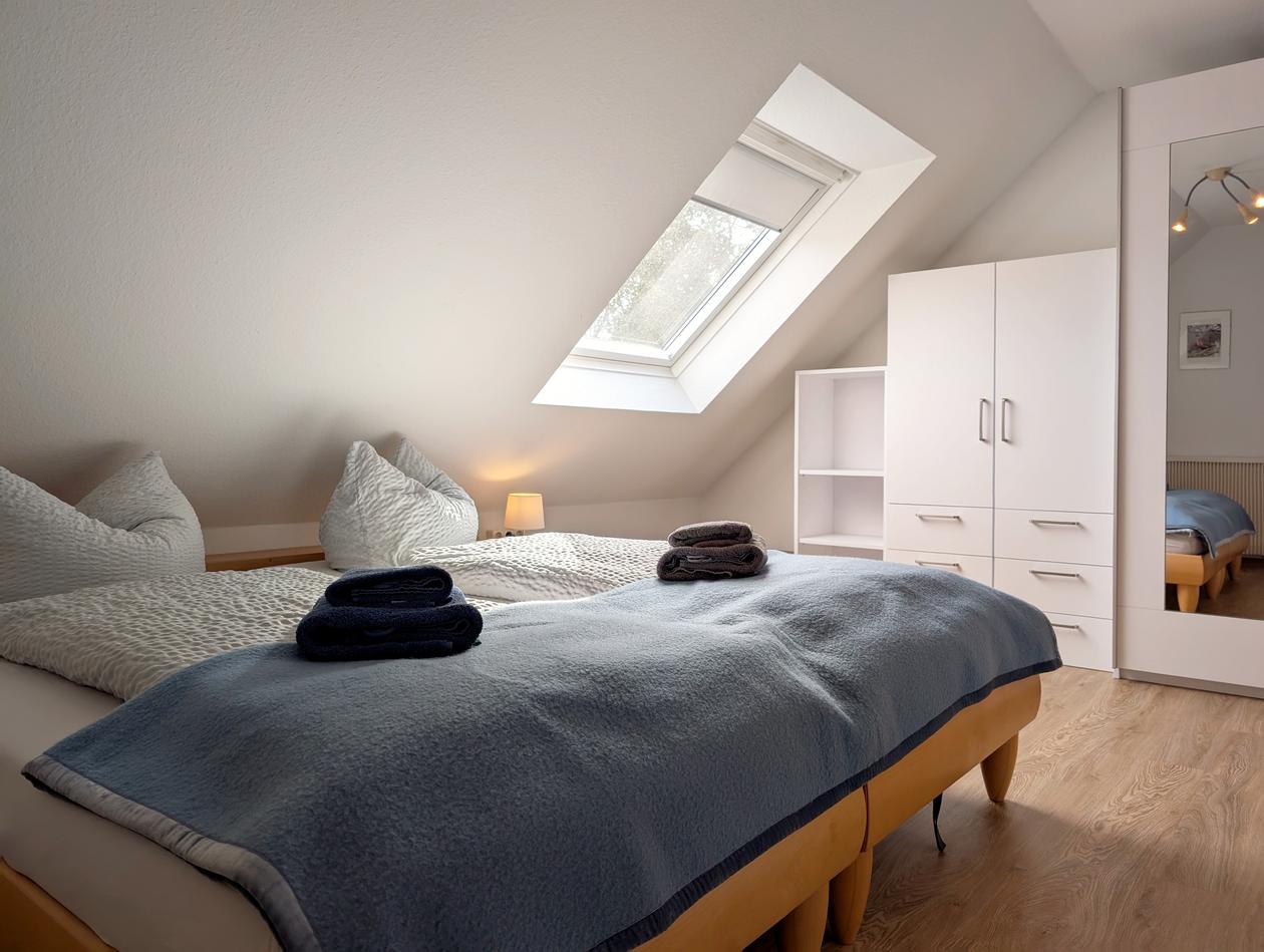 Im Schlafzimmer erwarten Sie zwei kuschelige Betten, um nach einer erholsamen Nacht frisch in den Tag zu starten.